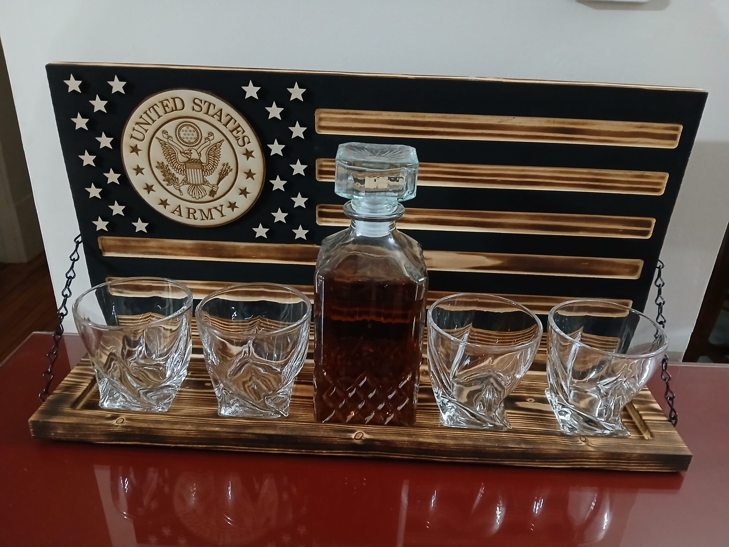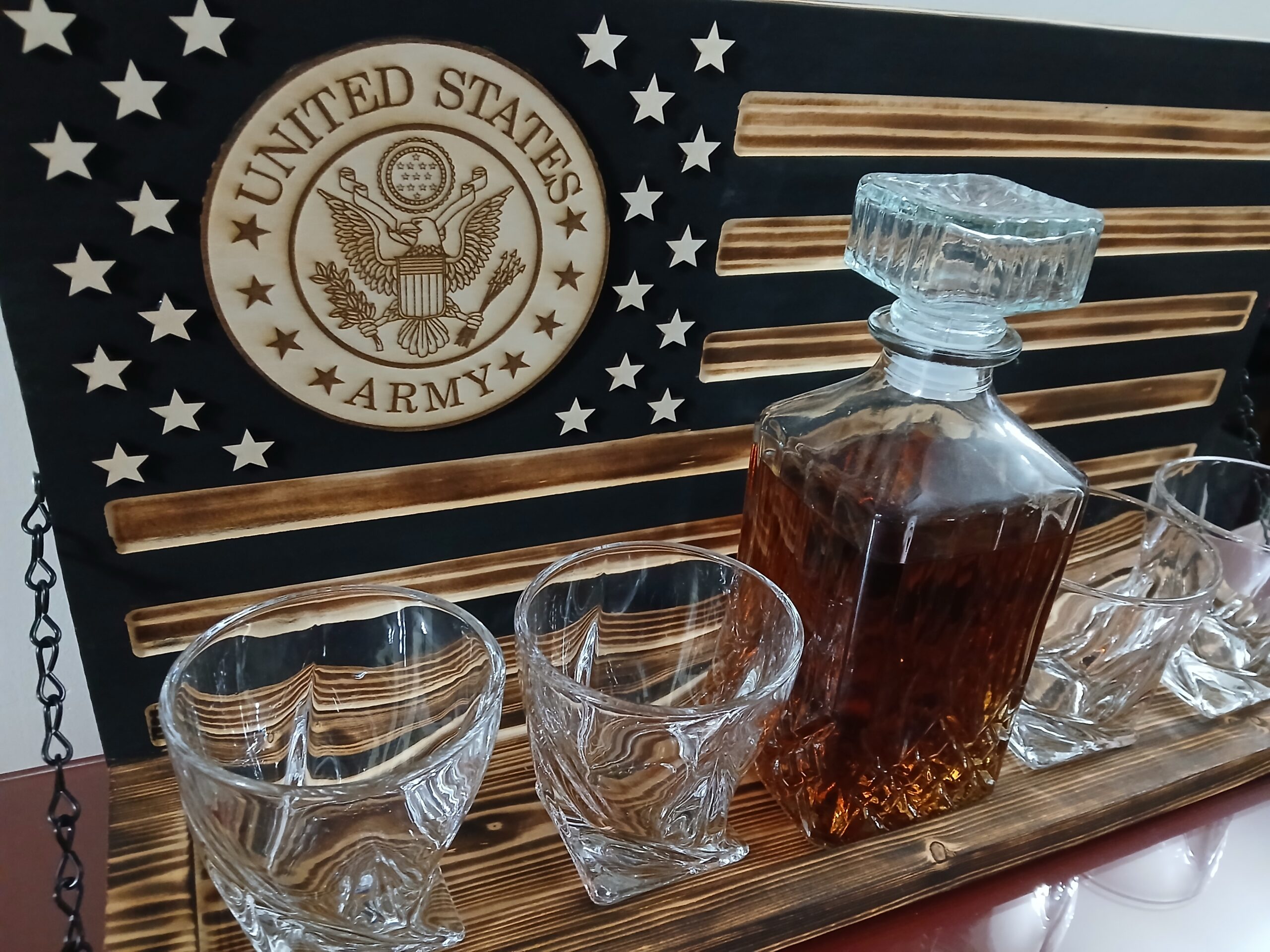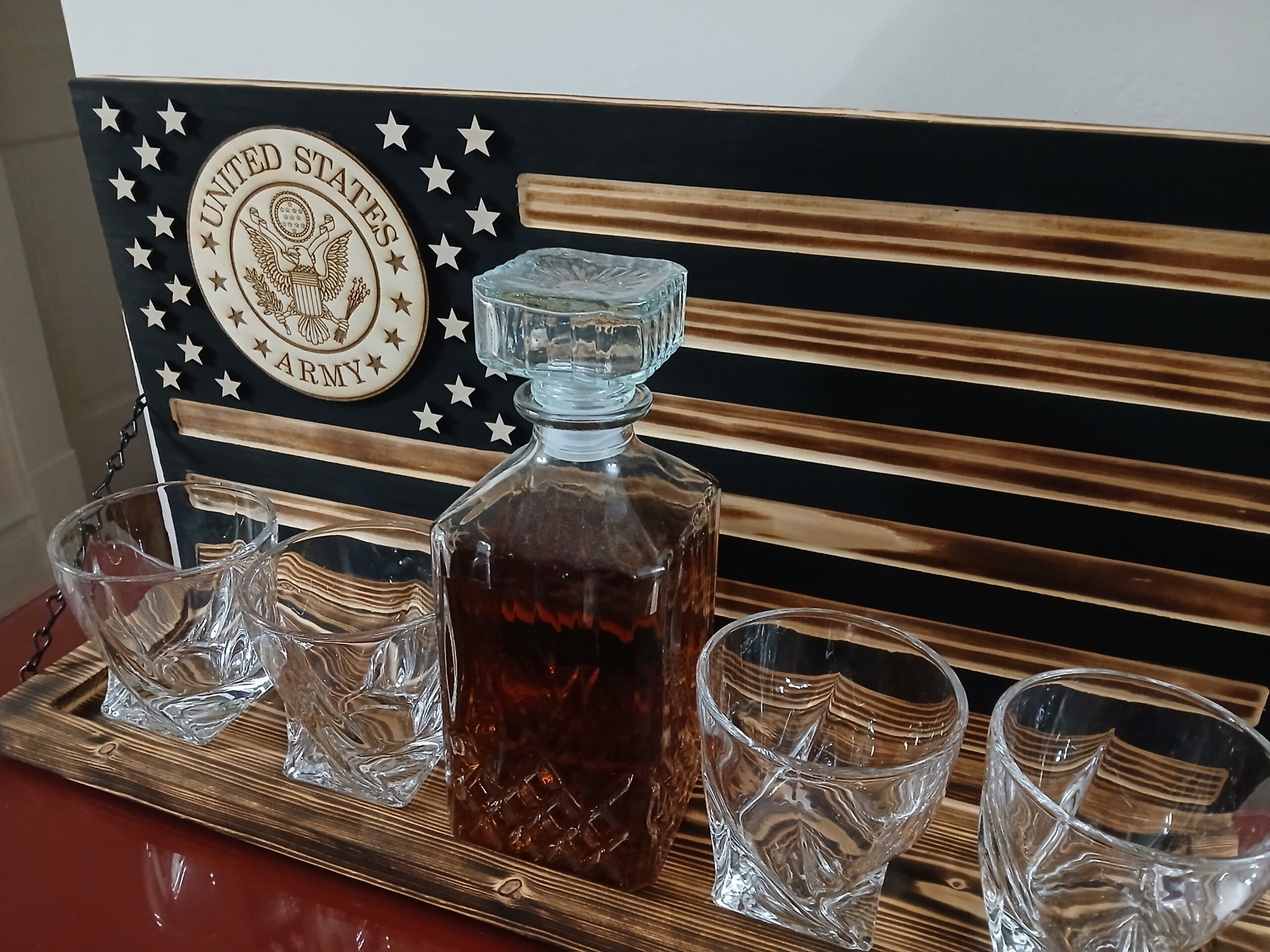 Handmade American Military Flag Whiskey Rack – Black & Wood Burnt Finish – Made to order!