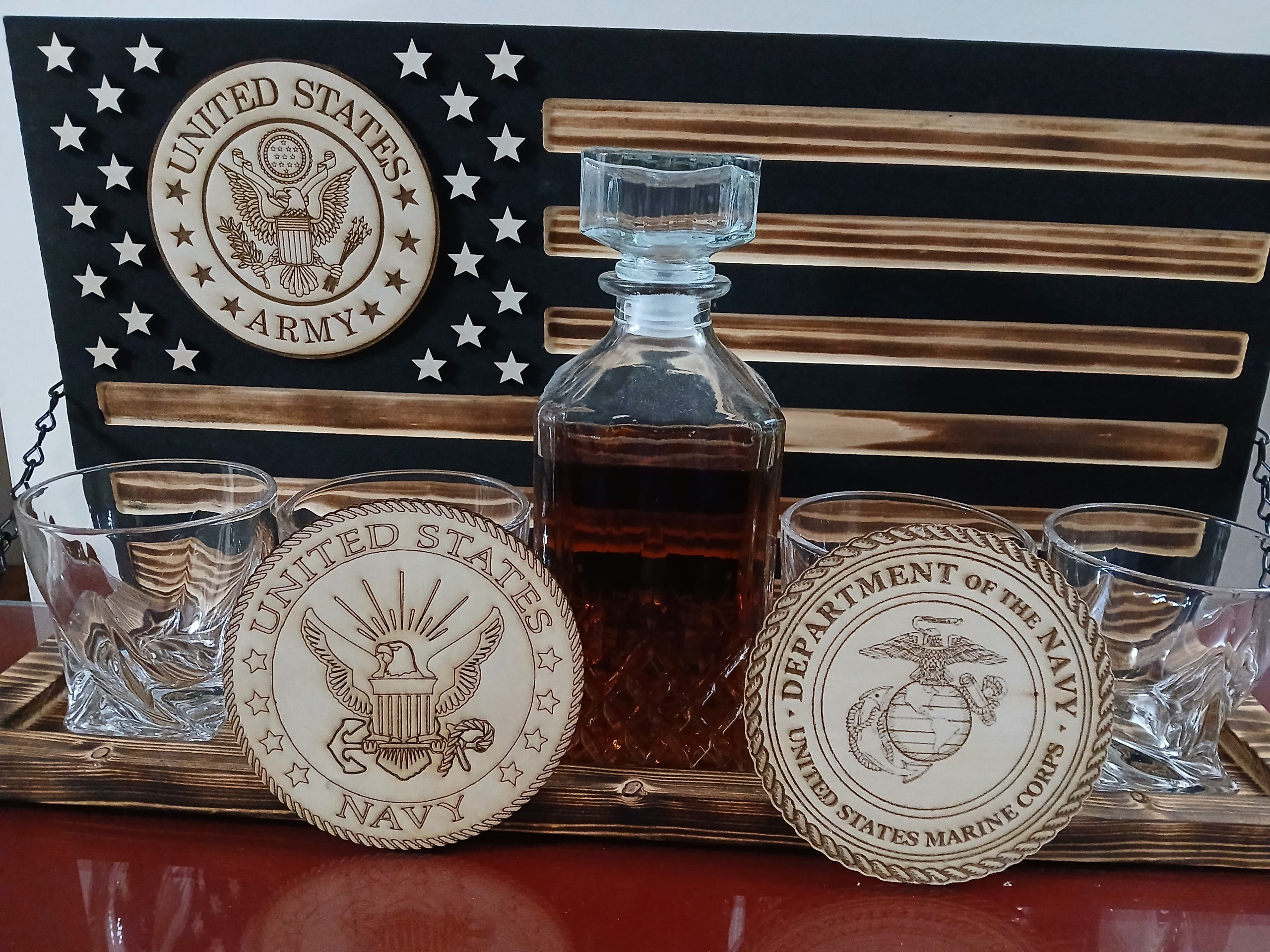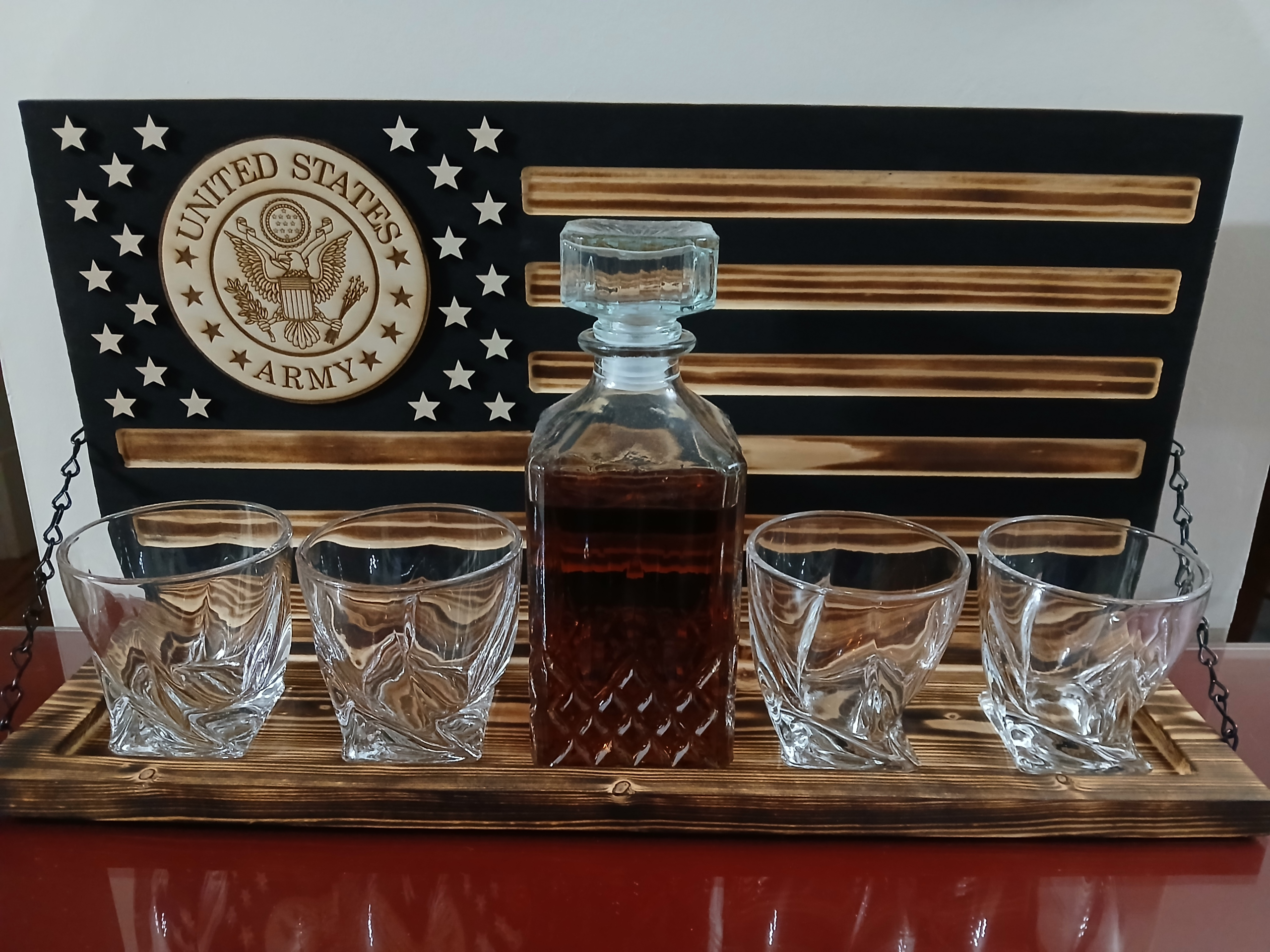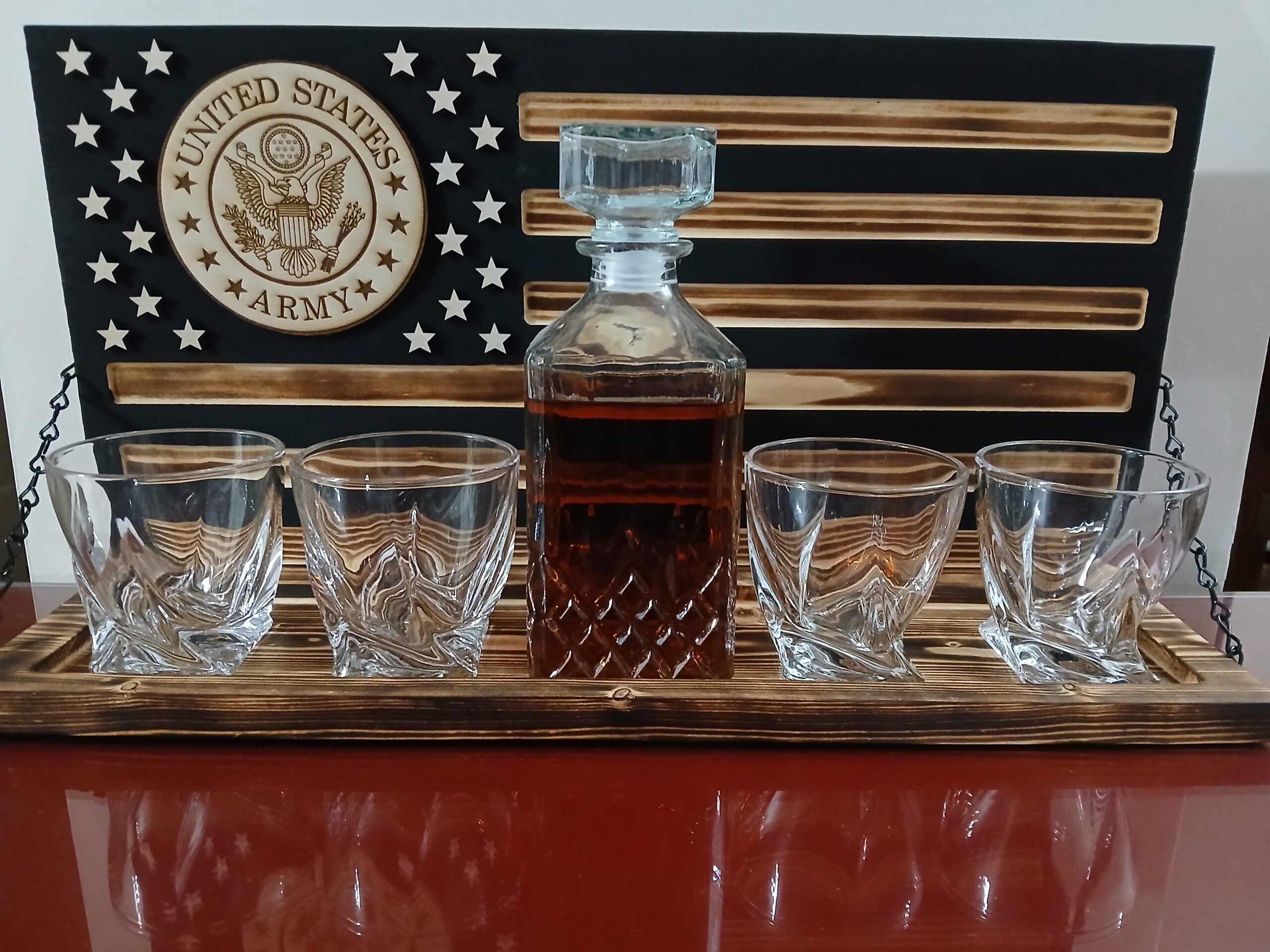 Handmade American Military Flag Whiskey Rack – Black & Wood Burnt Finish – Made to order!
