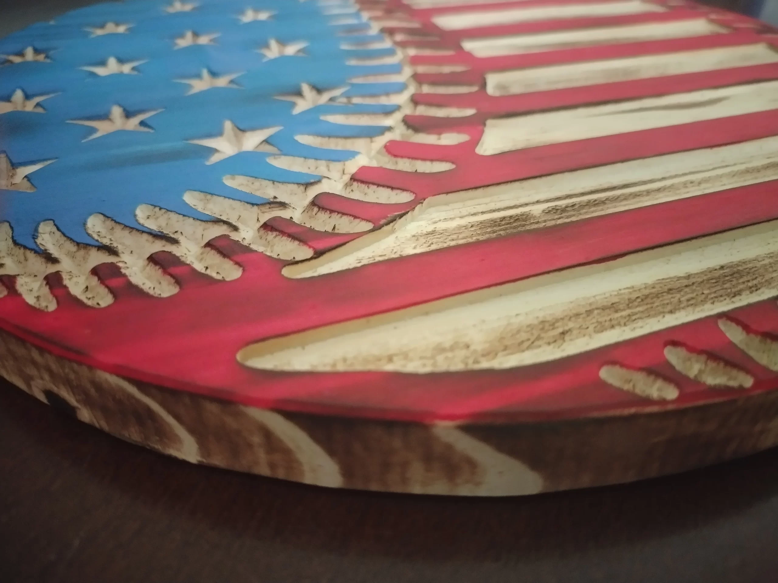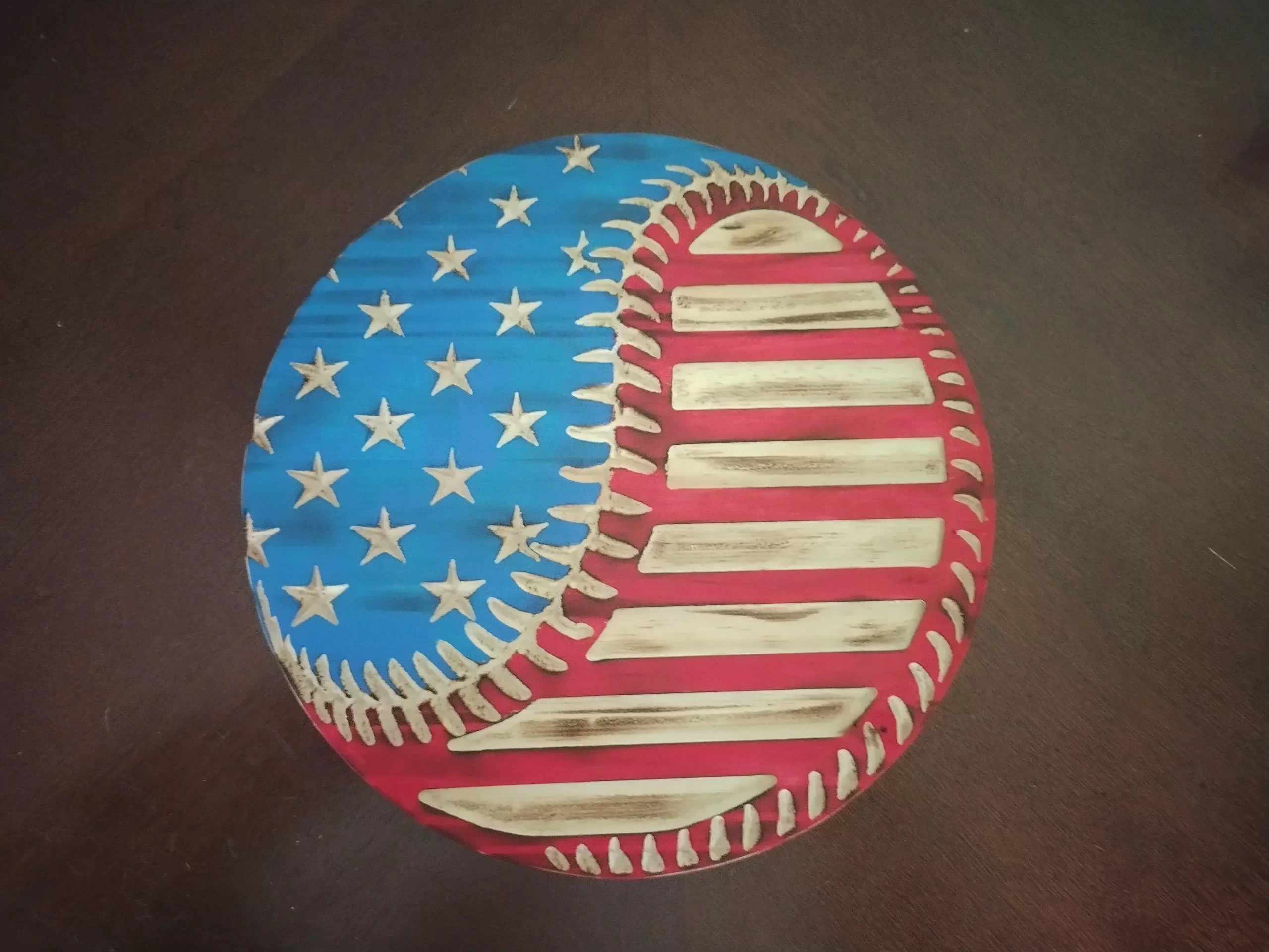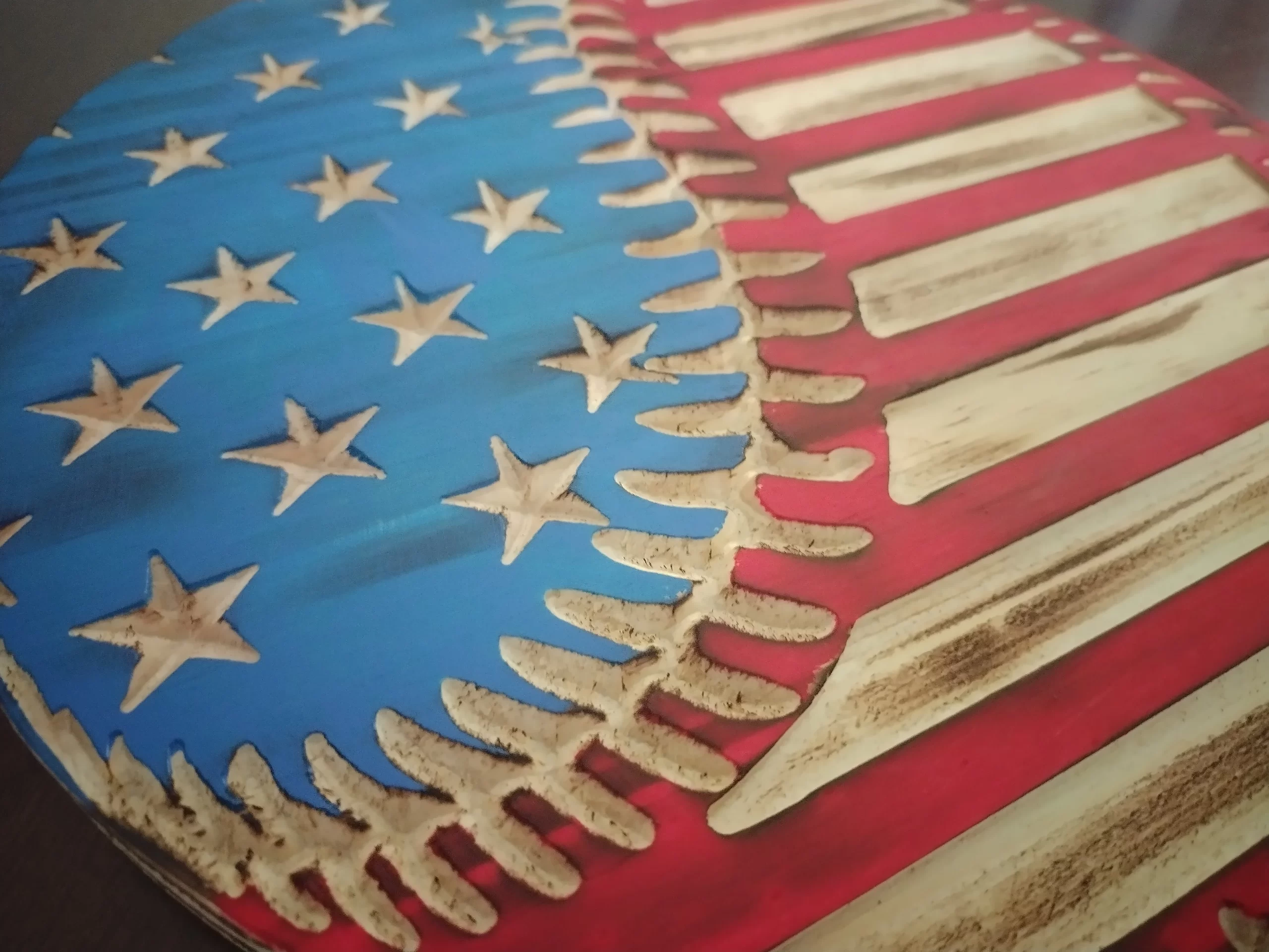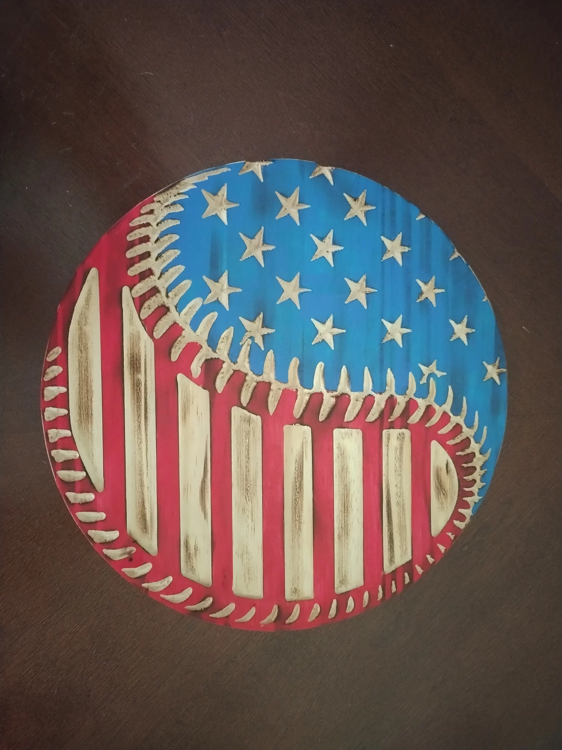 This Baseball American flag sign is 11 inches round and painted red and blue, black, burned or stained.