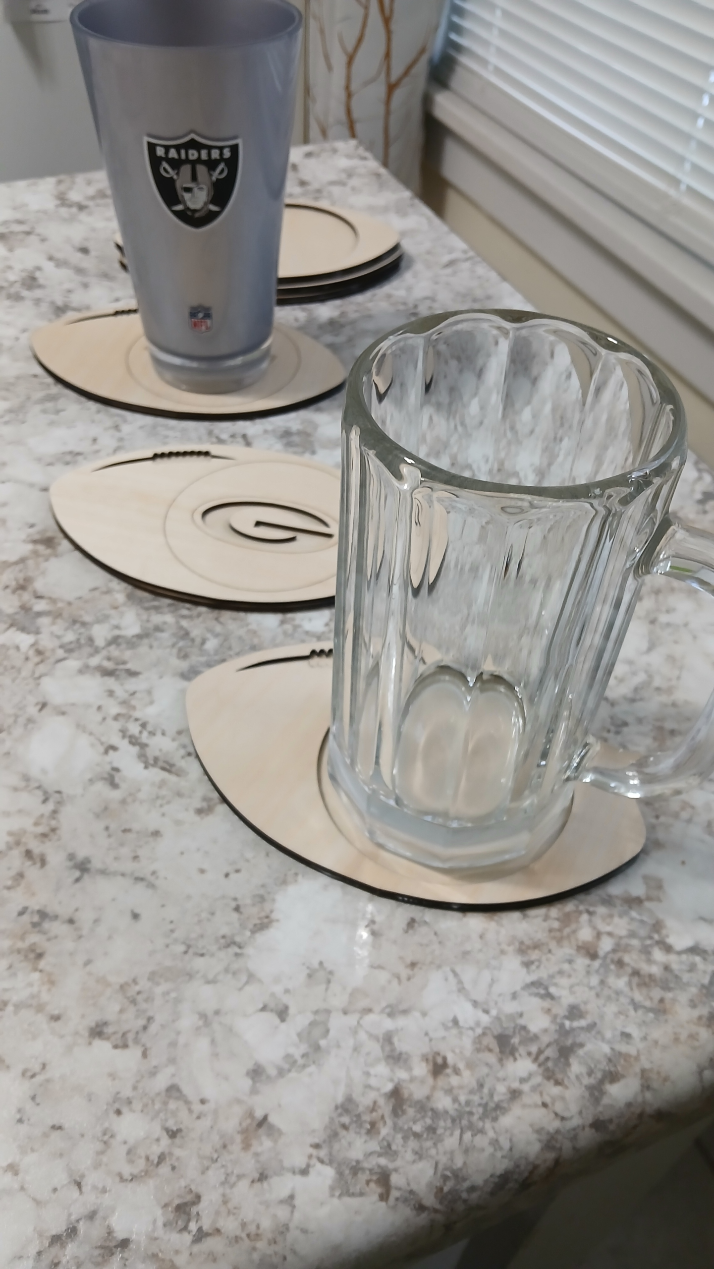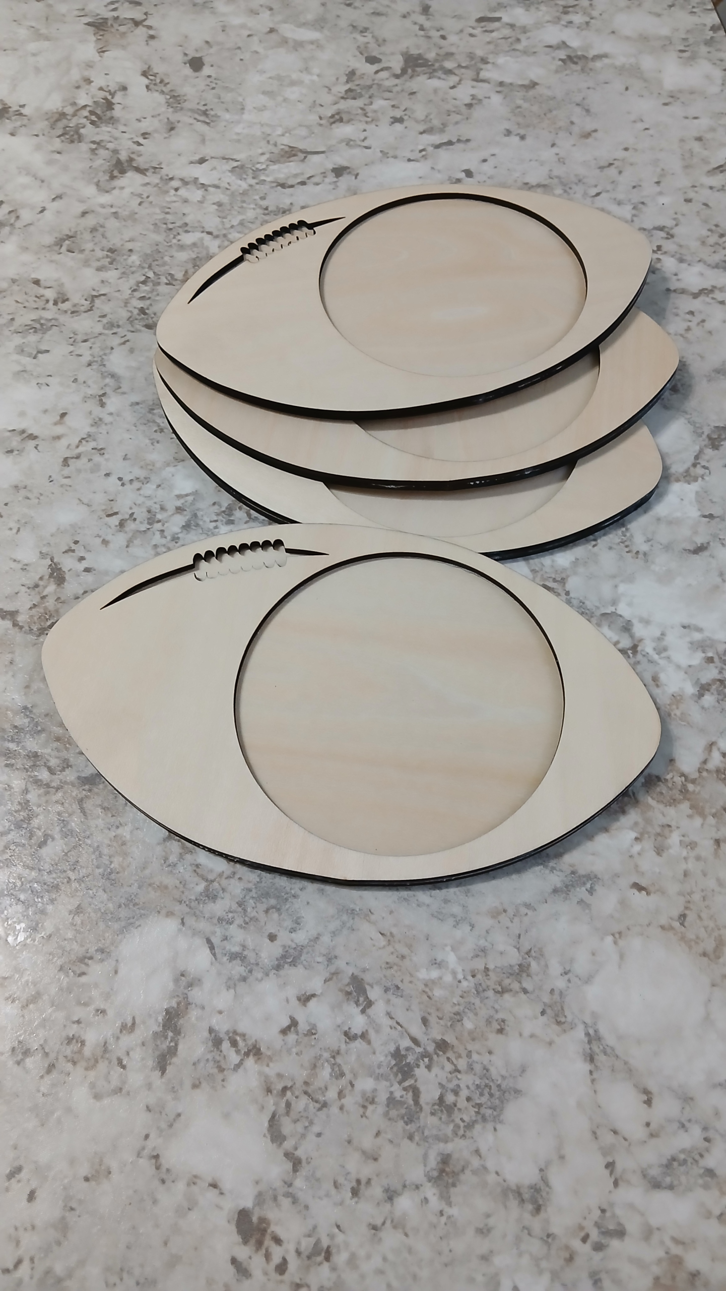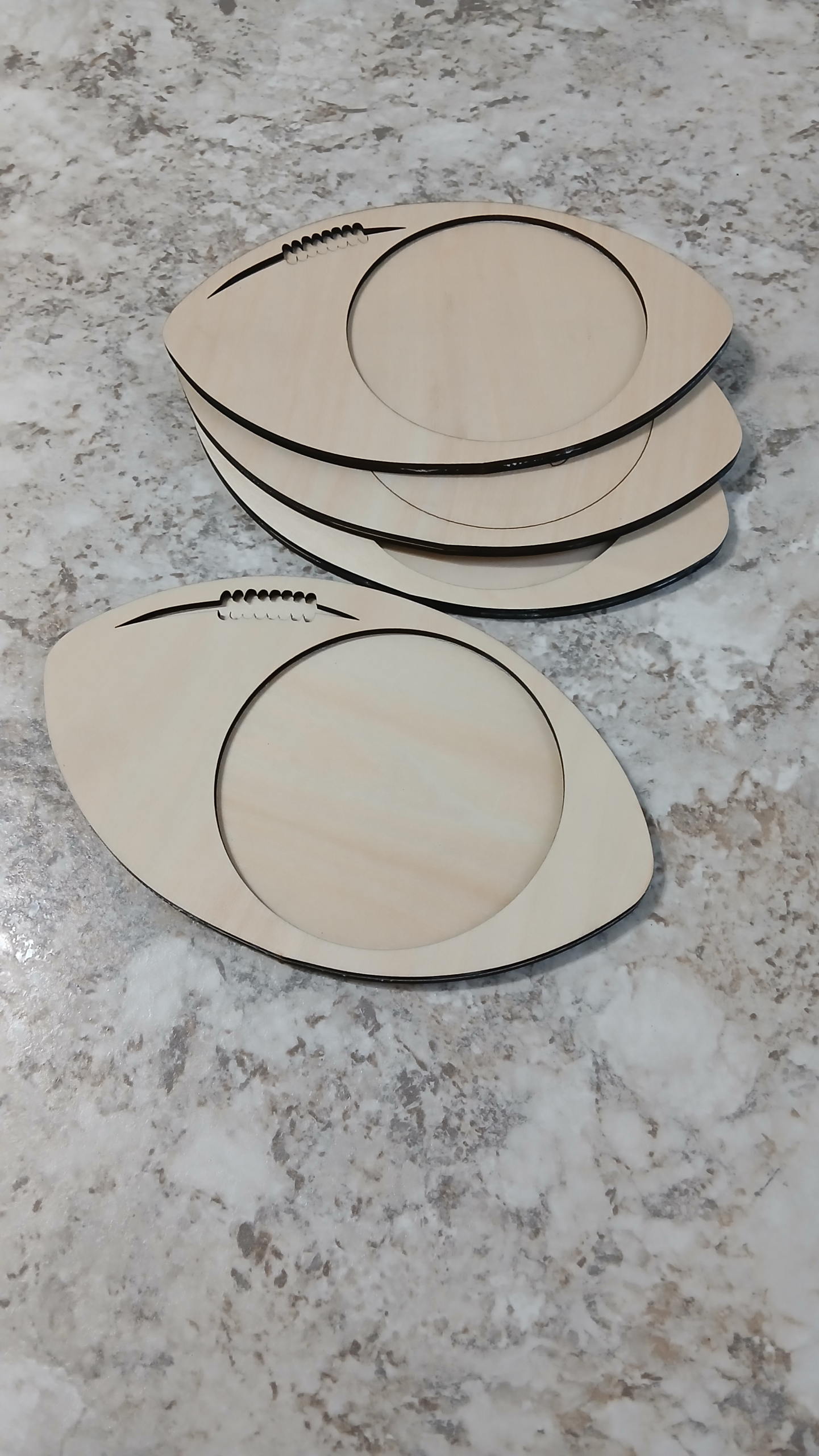 Score big with these handcrafted football-shaped wooden coasters, perfect for game day, sports fans, or as unique gifts! Each coaster is made from basswood, laser-cut for a clean finish, and features a football design with a round center — ideal for engraving your favorite team name, player number, or personalized message.