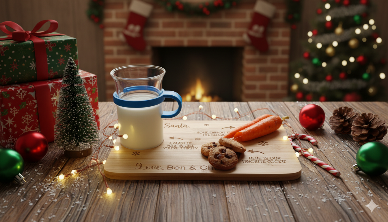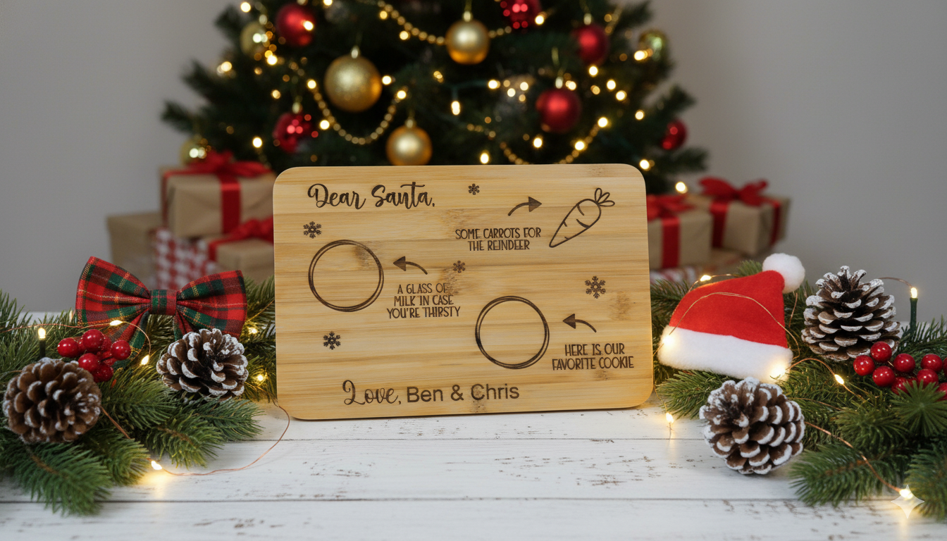 Festive Engraving: “Dear Santa,” “A glass of milk in case you’re thirsty,” “Some carrots for the reindeer,” and “Here is our favorite cookie” with cute holiday graphics.
