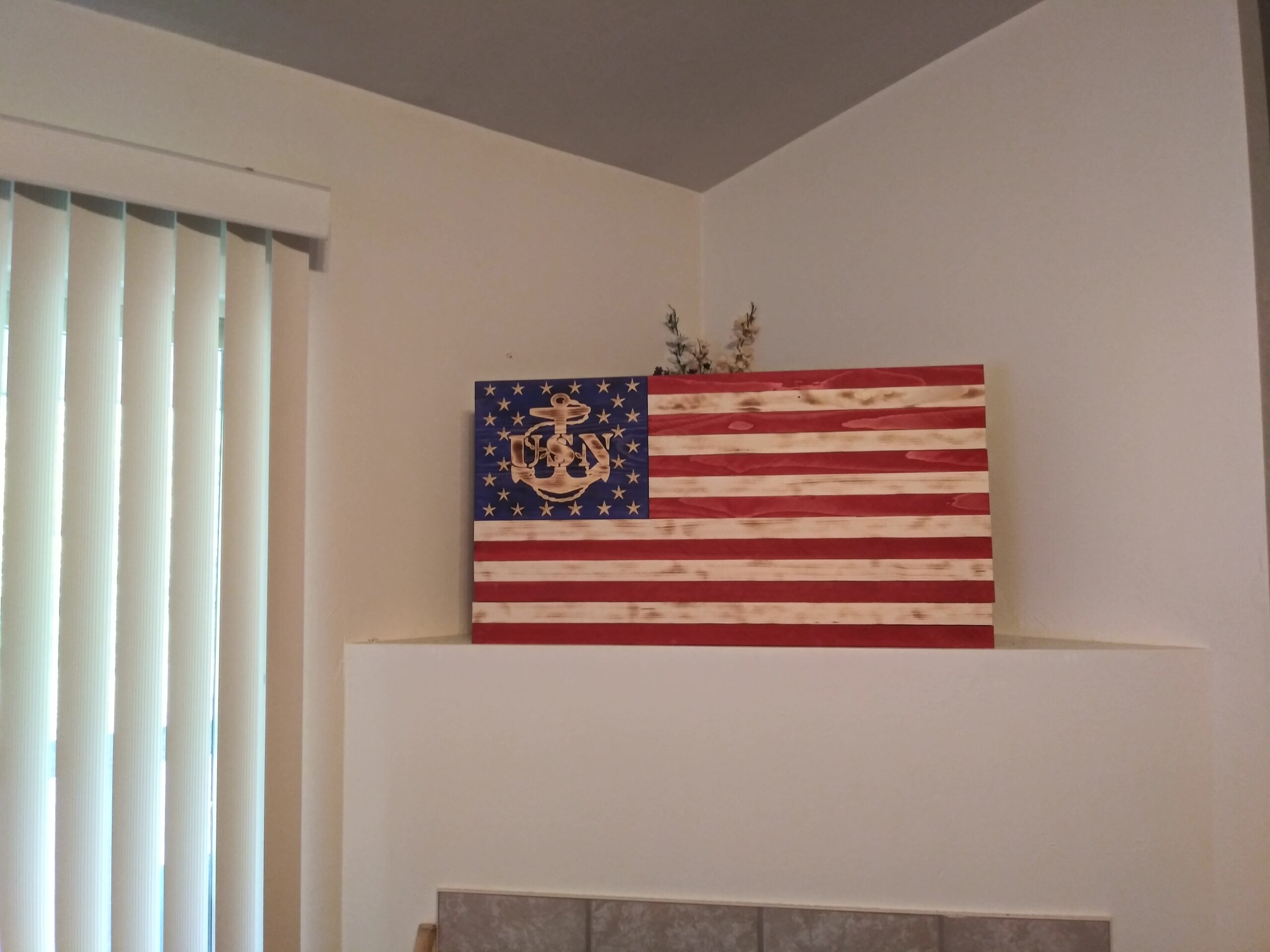 Natural wood design 19.5 x 36, Carved wooden stars and Navy Anchor in union. Lightly torched for worn effect.