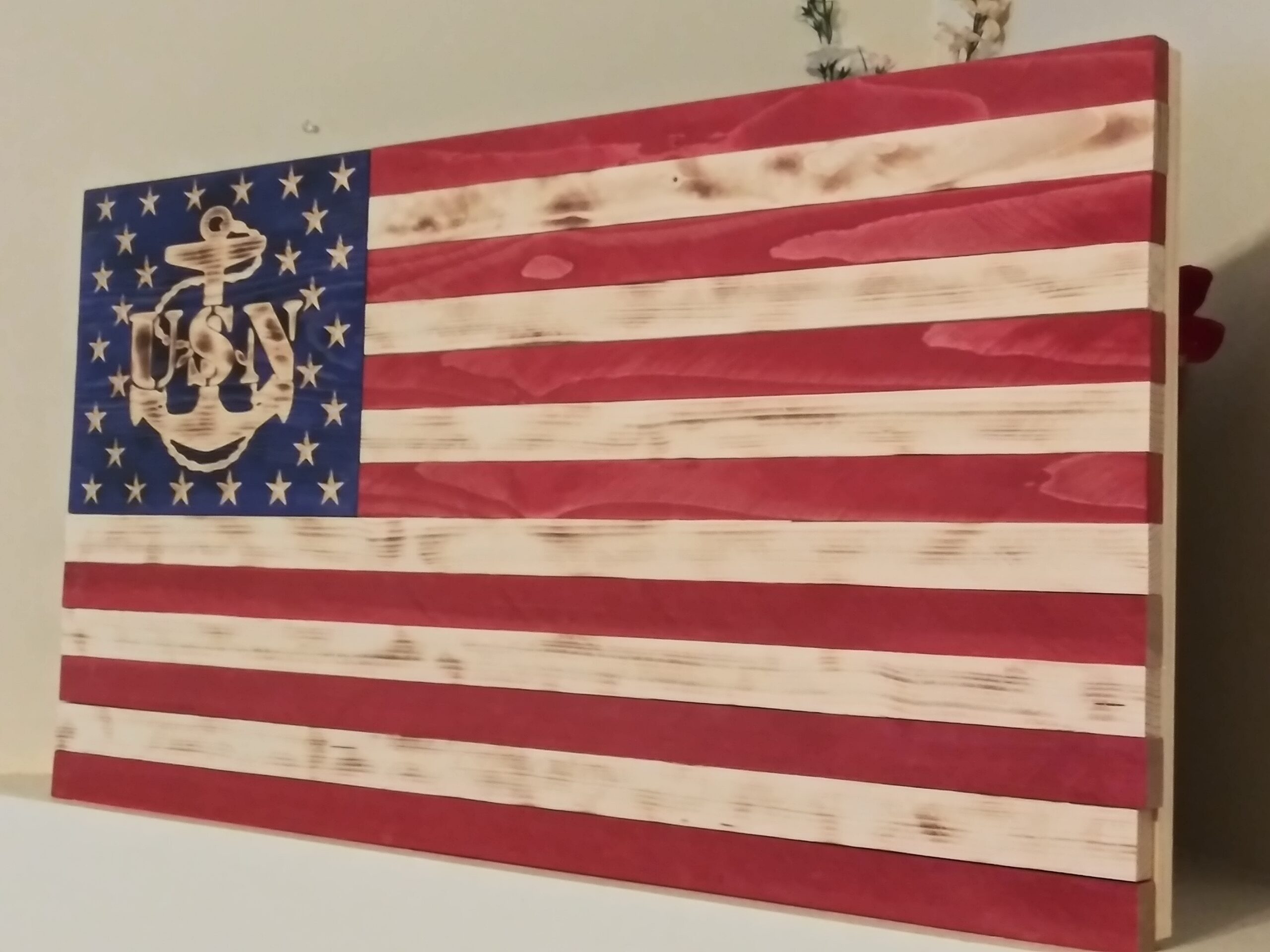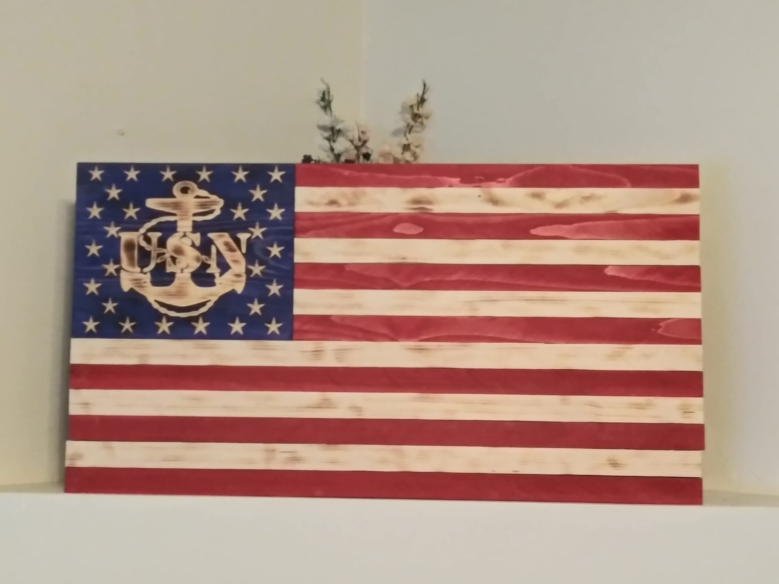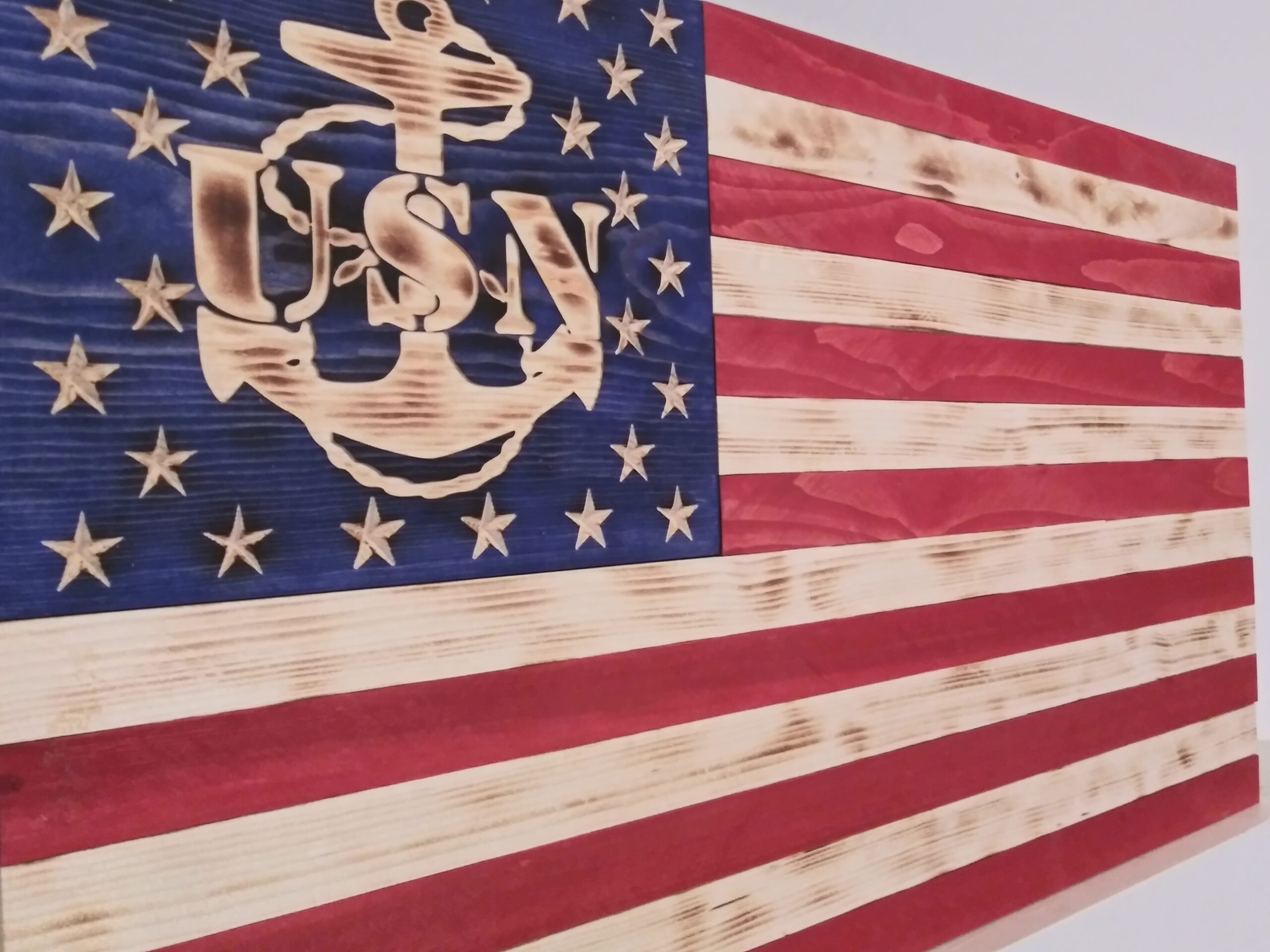 Rustic Burned & Stained US Navy Union Wood American Flag – Red, White and Blue, lighly torched.