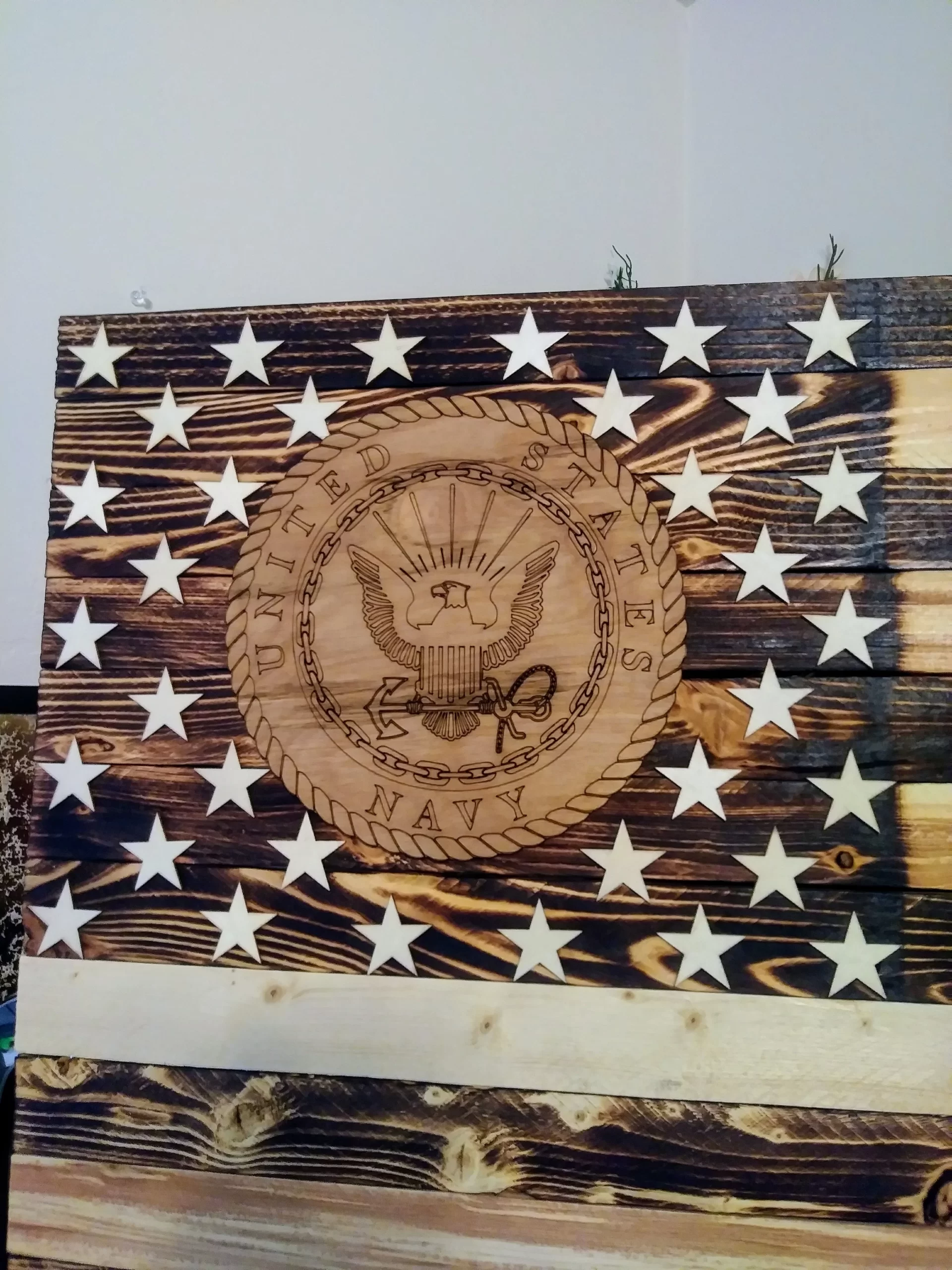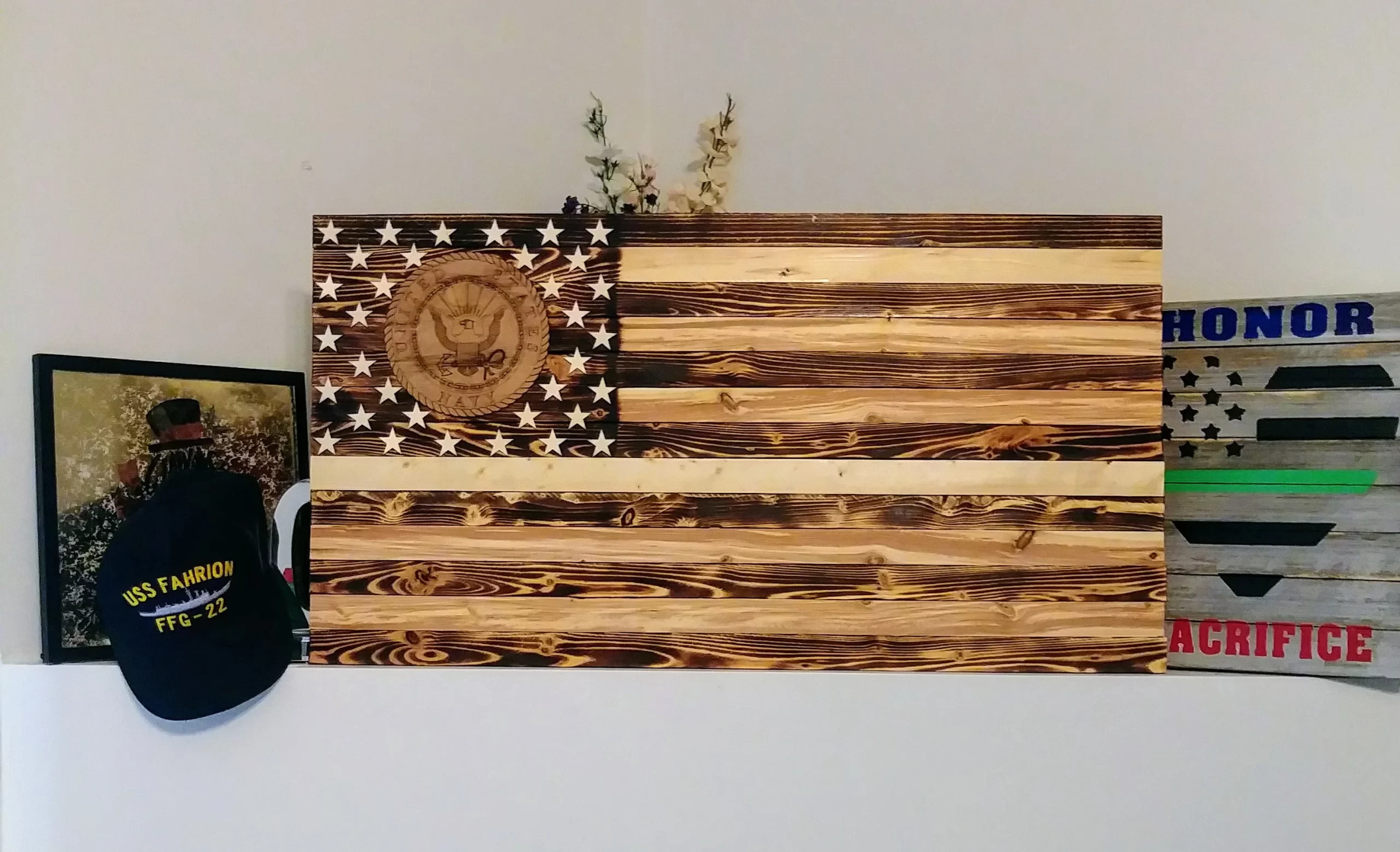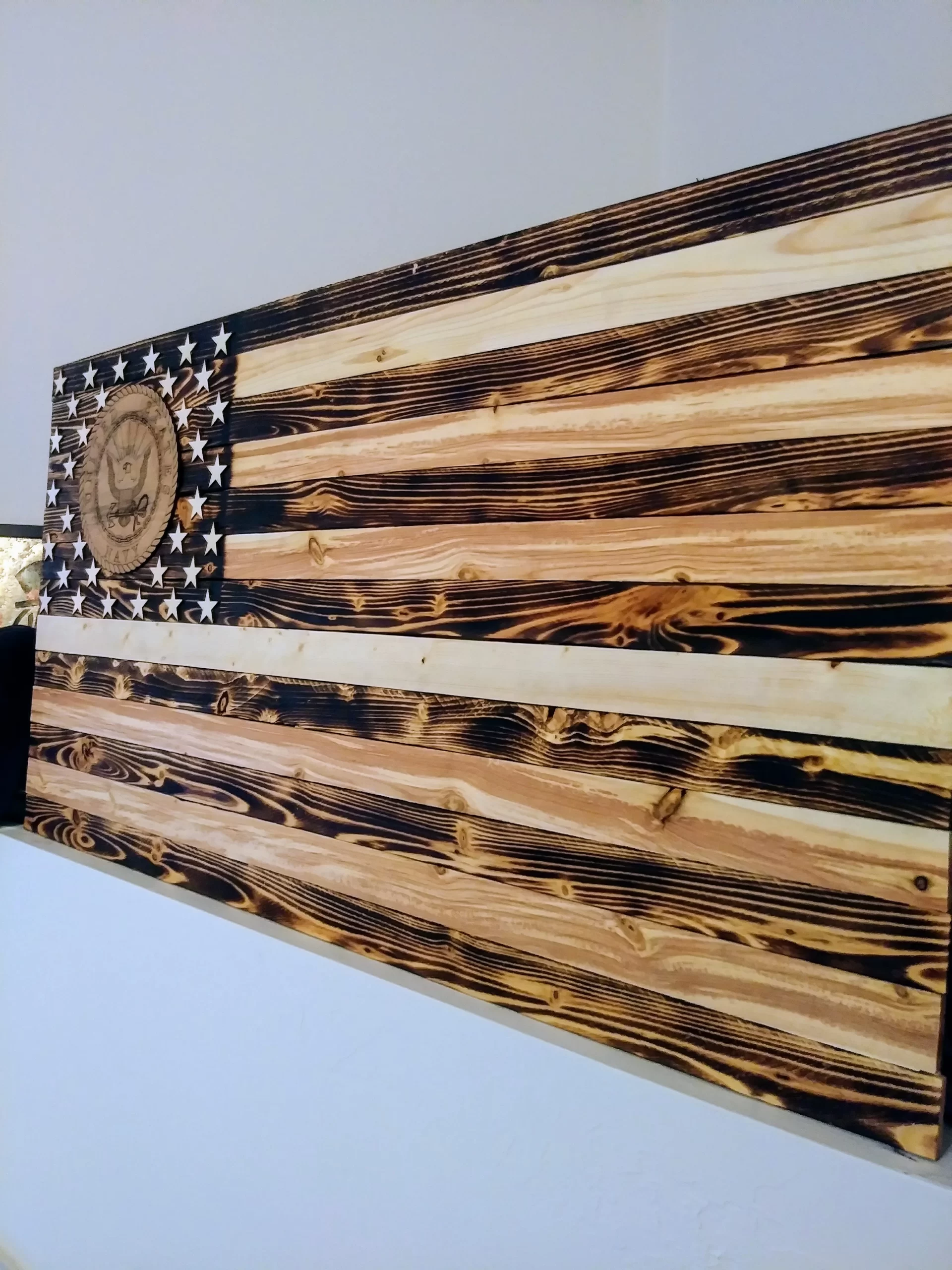 Rustic Burned Wood Navy American Flag